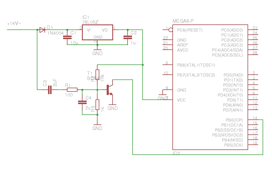 Was fehlt sind die LEDs, die hängen aber einfach mit MOSFETs an je einem Ausgangspin. Der Controller ist auch viel zu groß, aber der hat gerade im Programmierboard gesteckt kurze Beschreibung: die Versorgungsspannung wird hinter eine Diode geglättet und auf 5V geregelt. Die Diode ist notwendig, damit das Signal nicht verloren geht. Die Versorungsspannung wird über einen Kondensator vom Offset befreit, durch einen einfachen Tiefpass geschickt um unerwünschte Schwingungen herauszufiltern und dann auf die Basis von einem Standarttransistor (BC547) mit Basisvorspannung geführt. Dieser wirkt jetzt als Schalter und wackelt somit am Pin vom Mikrocontroller, der auf Input mit internem PullUp geschaltet ist. Kai |