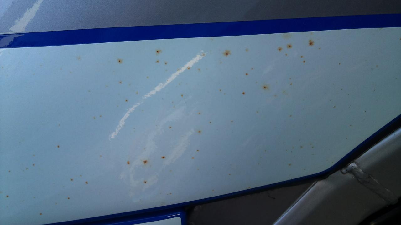 Rostpickel von innen nach außen, das merkt man aber, wenn man drüber streicht. Die sind erhaben, die Rostpickel drücken auch den Lack und die Aufkleber weg.