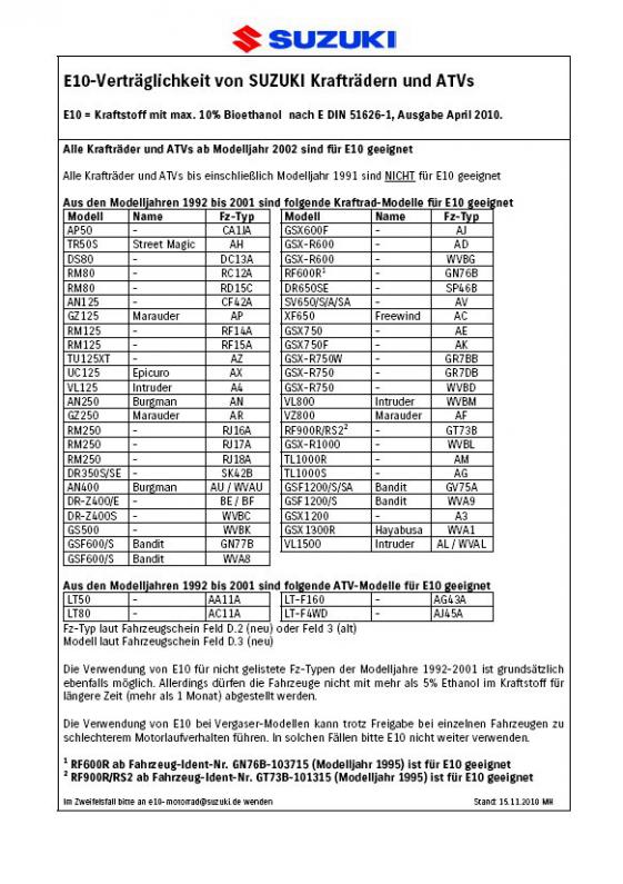 So, wie du den Thread liest, ist er auch. In der Liste steht die GS drin, allerdings die WVBK, nicht die GM51B. Das heißt, alle GSen von 89 bis 00 sind von Suzuki offiziell nicht für E10 tauglich eingestuft.