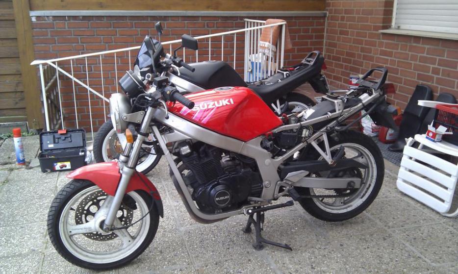 Suzuki GS 500 E, GM 51 B, Baujahr 1993, 40.000km Umbauten / Änderungen: - Fivestars Verkleidung - Cockpit innen verkleidet und mit Uhr und Öltemperaturmesser ausgestattet - "Costumetacho" eingebaut - andere Kupplungs und Bremshebel verbaut - neue Spiegel - LSL Fußrastenanlage - Led Blinker hinten - LED Rücklicht - Halogenblinker vorne - Felgen schwarz lackiert mit rotem strich - Edelstahl Kettenschutz - Topcase unter dem Nummernschild |