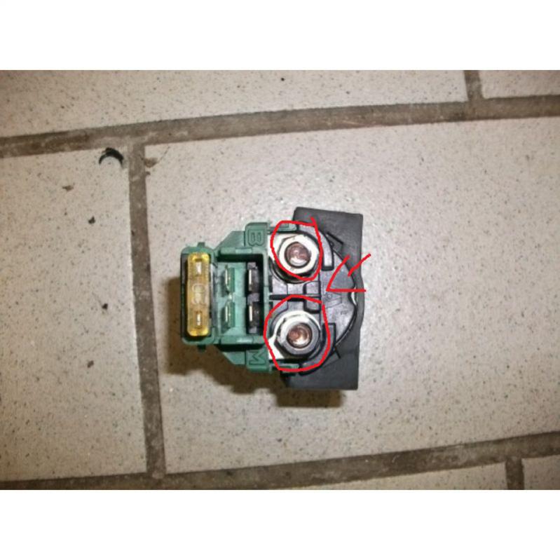 "so hab jetz nochmal das relais gebrückt ( batterie + an das schwarze was zum starter geht) und anlasser dreht wird wohl doch nur der schalter sein" Meiner Meinung nach hat er den Magnetschalter noch nicht durchgemessen oder getestet. @Mind Welche Lötstellen willst du erneuern? Am Starterrelais kommt man nicht dran ist alles zugebördelt und wenn man das Ding dennoch öffnet, reißen die dünnen Drähtchen ab, am Starterschalter sollten die Kabel gecrimpt und gesteckt sein. Die Lötstellen am Starterrelais gehen auch nicht auf. In meinem Buch über Motorradelektrik steht: "Ist die Arbeitswicklung defekt, hilft nur der Austausch. Sind die Schaltkontakte oxidiert, rückt das Relais zwar hörbar ein, aber der Anlasser arbeitet nicht. Überbrückt man die Kontakte mit massivem Metall (Schraubendreher) und der Anlasser dreht dann, sind es eindeutig die Kontakte. Manchmal hilft es das Starterkabel abzuschrauben und das Relais ohne Schaltstrom etwa 100 Mal zu betätigen. Mit etwas Glück reinigen sich die Kontakte dadurch mechanisch." Ich hatte meinen alten Magnetschalter zerlegt und die Schaltkontakte waren rabenschwarz veroxidiert und abgebrannt, das wunderte mich dann nicht, dass das nicht mehr geschaltet hat. Du kannst ja mal gucken, ob über den Anlasserschalter am Lenker über die gelb-grüne Leitung Spannung am Steckkontakt an der Arbeitswicklung ankommt, dann kannst du den Lenkerschalter und das Kabel auch ausschließen. Voltmeter + an gelb-grünes Ede (Kabelschuh) und Voltmeter - an -Pol der Batterie halten, wenn 12 V angezeigt wird, funktioniert das. Die Arbeitswicklung kann man auch prüfen, einfach Spannung auf die Wicklung geben. Am gelb-grünen Anschluss + am schwarz-weißen Anschluss - anschließen. Guck wie der Stecker auf die Anschlüsse passt. Dann sollte es klacken, wenn nicht = Arbeitswicklung durchgebrannt.