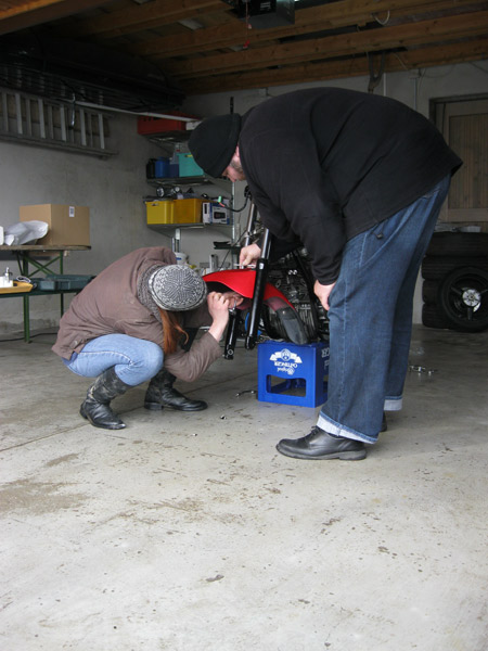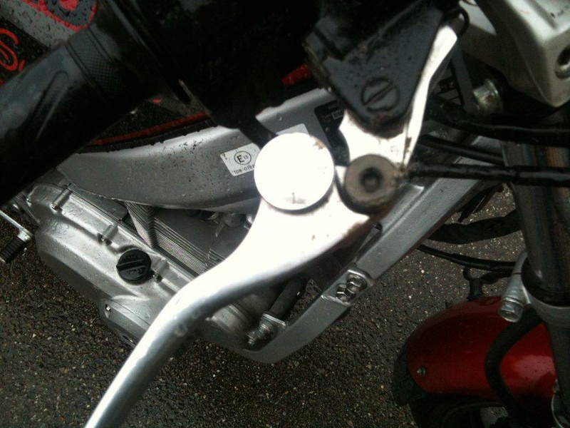So, Tüv'er war vor ner Std da, da war Lisa noch mit Schieben beschäftigt. Zweite Linkskurve, zu viel Split. Amsel und Rinker machen sich nach links lang. Teufelchens Sturzbügel haben alles abgefangen, die Kupplungseinhängung ist trotzdem hinüber. Also heute nur anmelden, Kennzeichen holen und auf nächste Woche warten...