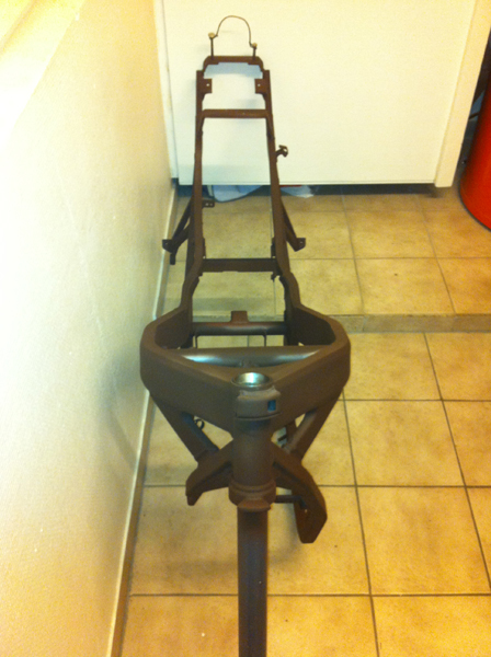Zum jetzigen Zeitpunkt stehen der Rahmen, Schwinge und Gabeln sowie Lampenhalterungen, Klemmböcke und Cockpit in einem schönen Glanzschwarz in meiner Garage. Opa war so nett Leider sind ein paar Patzer passiert, ich hoffe, dass ich die dieses WE etwas raus schleifen und nochmal übersprayen kann...