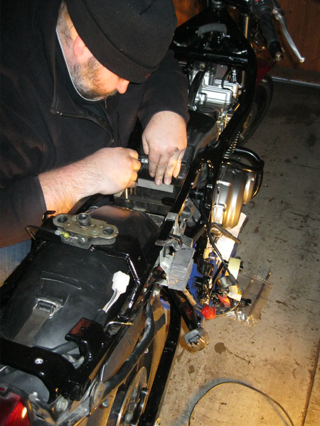 Neben der Generalüberholung (Motordichtungssatz, neue Kette, neues Öl, etc.) verbastel ich vorher die kleineren Blinker die heute in der Post waren (Merci an Tante Louise...), ein schwarzes Windschild und schwarze Sturzbügel die ich Teufelchen abluchsen konnte.