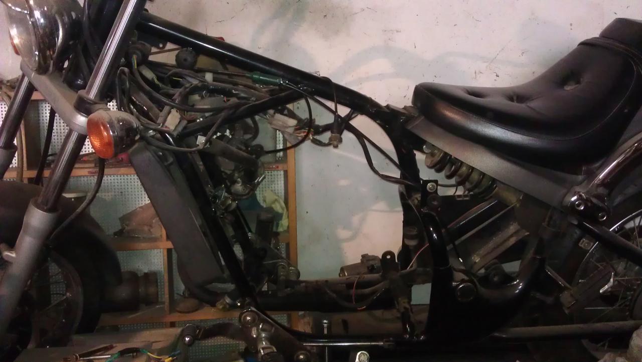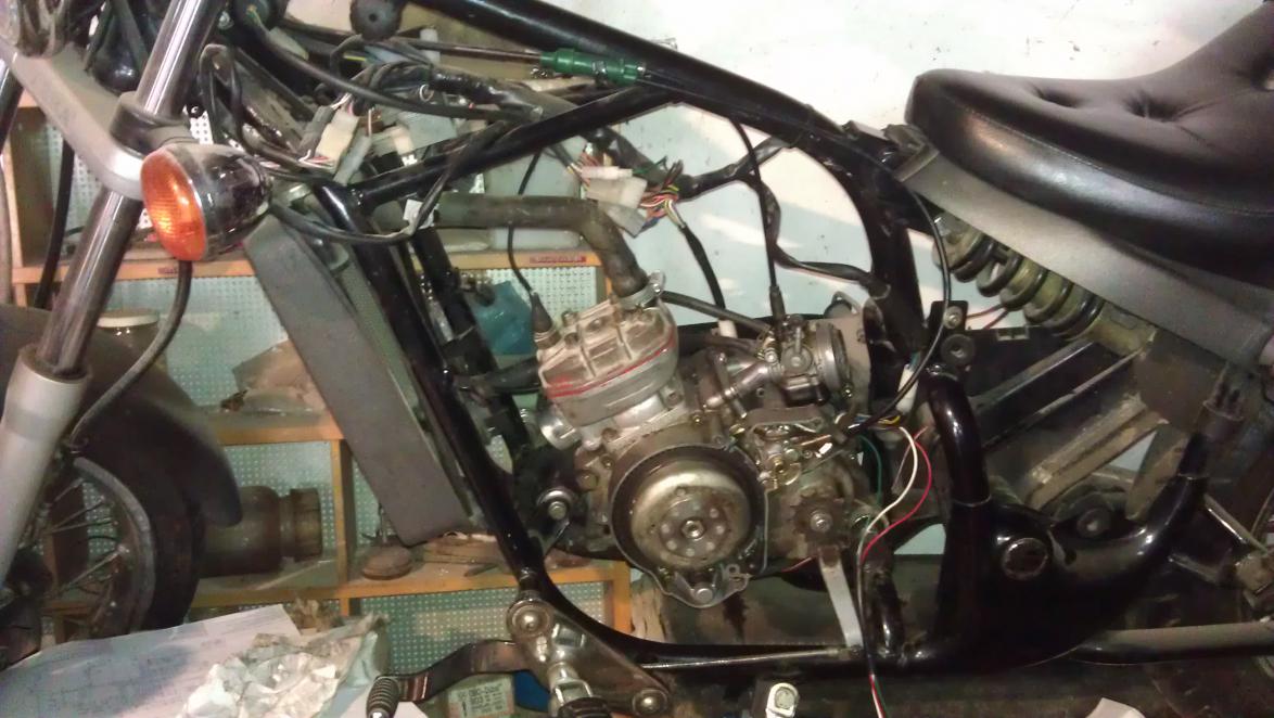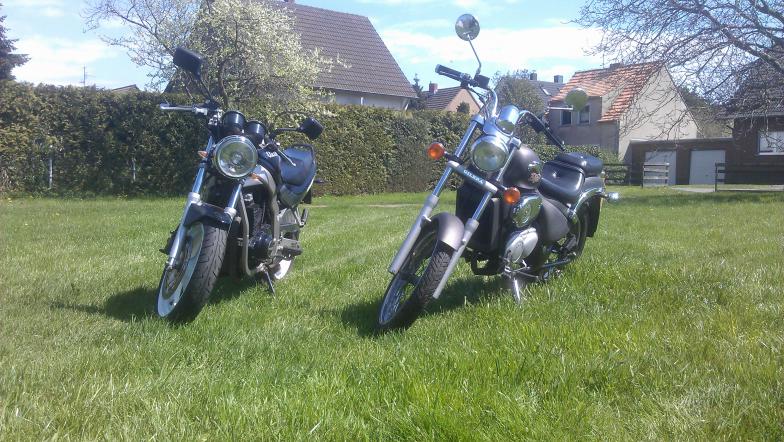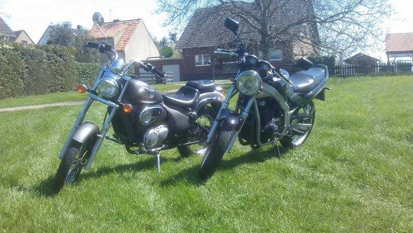 ich wollte euch mal mein kleineres Projekt vorstellen: Im Jahr 2009 habe ich zusammen mit meinen Brüdern und meinem Vater zwei Gilera Eaglet 50 ccm Chopper gekauft. Eine Davon war in Einzelteilen, die andere am Stück. Kaum zu Hause angekommen, haben wir die Eine mit wenigen Handgriffen fahrbereit gemacht (Batterie ausgetauscht, Kontaktspray an den Anlassknopf). Auf der Probefahrt gab es dann zwei Überraschungen: 1. Zusammen mit meinem Vater und meinem Bruder lief die 50er nach dem lagsamen warm fahren 110km/h und war noch nicht im Drehzahlbegrenzer. 2. Die Antwort darauf kam kurze Zeit später mit einem blockierenden Hinterrad bei eben dieser Geschwindigkeit. Unsere Vermutung war natürlich: Kolbenkipper. Dann haben wir kurzerhand den gesamten Motor ausgebaut und den anderen, von dem zweiten, demontierten, Moped eingebaut. Dummerweise passten Stecker und auch Anzahl der Kabel nicht bzw nur teilweise. Naja nach ein bisschen rumgefrickel hat dann alles funktioniert. Zumindest hätte es funktionieren sollen... Ein Kabel wurde bei Zündung warm und fing an zu qualmen. Nach mindestens 50 mal die veränderten Steckverbindungen kontrollieren, haben wir es für ein paar Jahre aufgegeben und die Mopeds standen hier nur rum. Anfang diesen Jahres habe ich einfach mal das komplette Teil auseinander genommen und wieder zusammen gesetzt. Diesmal mit dem alten Motorblock, und dem anderen Zylinder + Kolben. Dabei ist mir aufgefallen, dass der Kolbenfresser-Motor einen 70ccm Satz verbaut hatte. Daraus ziehe ich die Rückschlüsse, dass der Vorbesitzer ihn nicht eingefahren hat. Ich bin mir sicher, dass er die Mopeds deswegen verkauft hat. Jedenfalls habe ich alles Zusammen gebaut. Das Kabel fing aber immer noch an, warm zu werden. Nach und nach habe ich alle Bauteile ausgetauscht, hat aber nichts geholfen. Bis dass ich den gesamten Kabelbaum durchgemessen habe und mir aufgefallen ist, dass der Stecker zur LiMa (da, wo das Kabel warm wird) gleich dem Stecker zum Öltank ist. Wie ihr euch sicher denkt, haben wir - dumm wie wir sind - die beiden Stecker vertauscht... Umgesteckt, Zusammengebaut, angeschmissen. Das Moped läuft jetzt im originalen Zustand 80 km/h. Die zweite steht auf meiner Werkbank und nimmt immer mehr Gestalt an. Hierfür muss ich nur noch neue Teile besorgen. Ich habe natürlich ein paar Bilder für euch mit meiner GS: