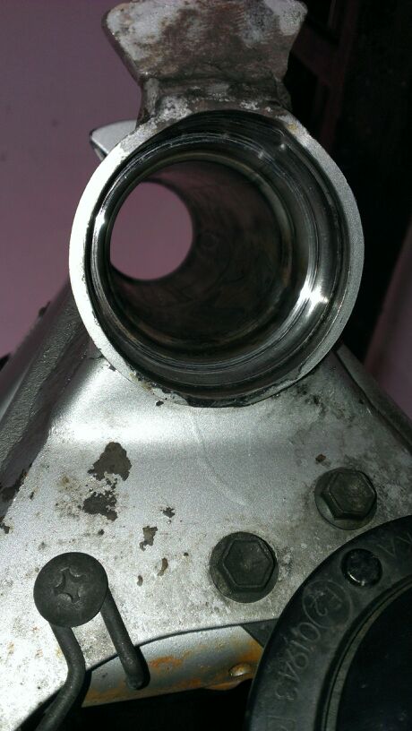 Ich bin mir nicht ganz sicher, aber ich denke, das der Lenkanschlag maßiv einen mitbekommen hat und dadurch den Lagersitz ziemlich in mitleidenschaft gezogen hat. Ich kann mich aber auch irren, aber da vorne sollte es rund sein.