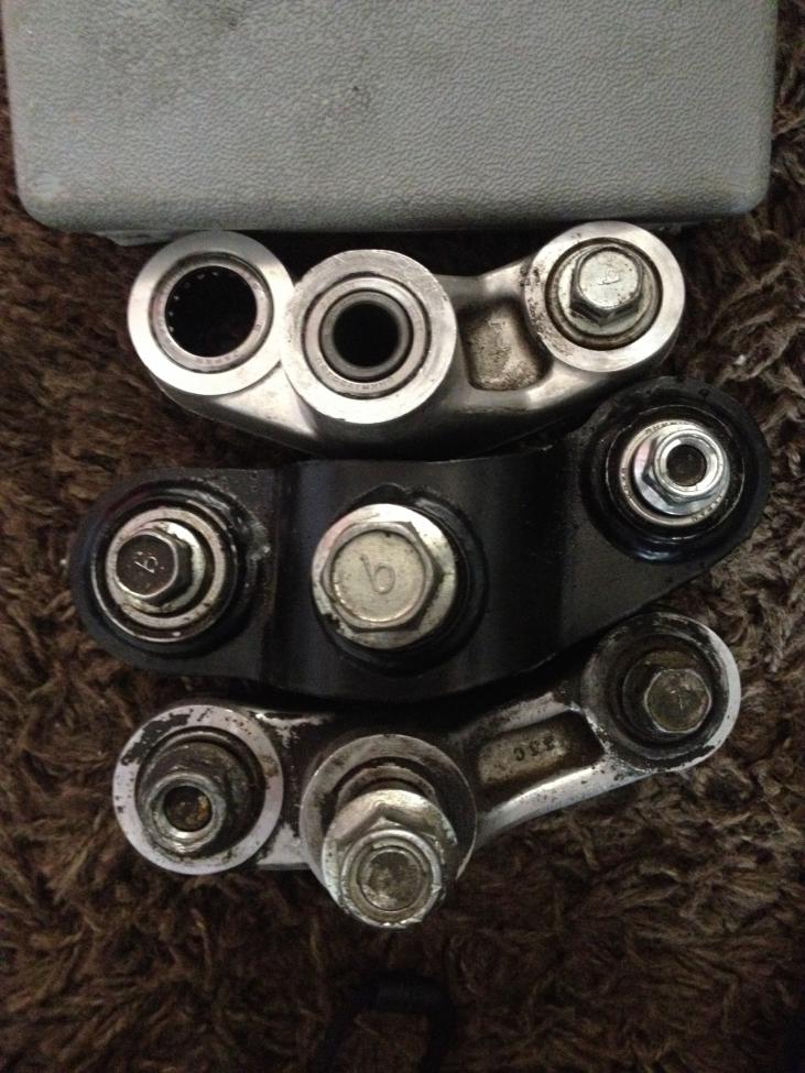 Ich habe ein Bild mit 3 verschiedenen Umlenkung hochgeladen an denen man die Unterschiede gut erkennen kann. 1. RGV250 Umlenkung 2. GS500 Umlenkung 3. Bandit 1200/600 Umlenkung (müsste sogar noch in etlichen anderen Suzuki-Modellen zum Einsatz kommen. Das Problem liegt meistens an der hohen Bauform der GS-Umlenkung. Austauschfederbeine können an der Oberkante der Umlenkung (zw. 2. u. 3. Schraube) anstossen und müssen unter Umständen z.B. durch eine "schlankere" Umlenkung ersetzt werden. Manchmal reicht es auch aus nur einen anderen Umlenkhebel zu verbauen. Interessant sicher auch der unterschiedliche Winkel der jeweiligen Umlenkung. Die Schraubengröße ist bei allen drei Umlenkungen identisch. Befestigungsschrauben von links nach rechts : Rahmenbefestigung - Umlenkhebel - Federbein |