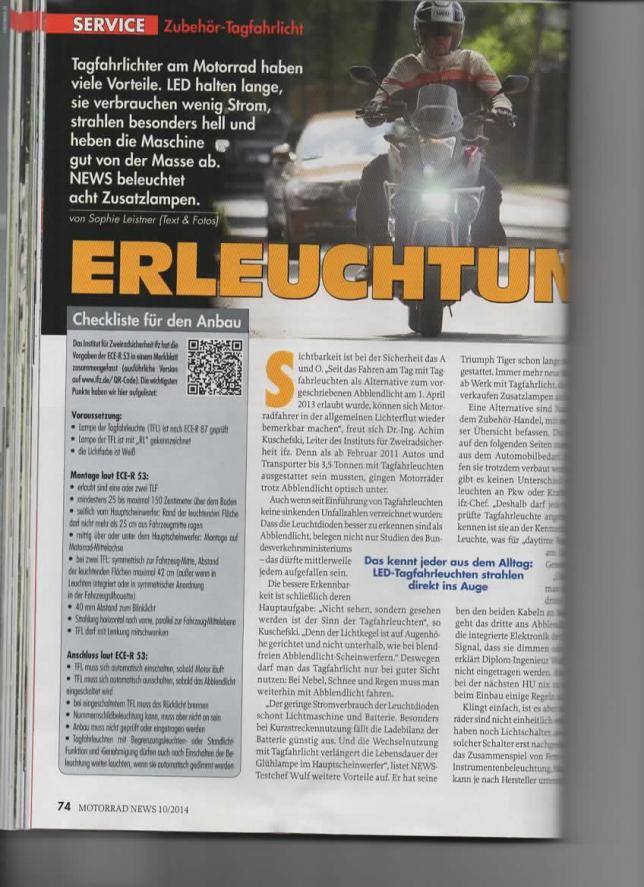 mein Rücklicht wollte ich auch in diesem Zuge umbauen (Monster Style LED Leuchte) Das Rücklicht stellt mich allerdings vor weniger Fragen Allerdings bin ich mit dem Rücklicht vorsichtig, mein Bruder hat sich bei seiner NC 700 ein neues LED Rücklicht angeschraubt, welches bei Tag absolut nicht zu erkennen ist, geschweige denn das Bremslicht... Im Zweifelsfalle im Laden mal testen lassen und vergleichen. nach neuer Regelung darf ein TFL am Mopped montiert sein, dient am Tage als Ersatz für das Abblendlicht (für die LiMa ca. 50W gewonnen) und es gibt auch Regelungen, in welchen max. Abständen das TFL montiert sein muss. Ob das TFL unbedingt für Motorräder ausgeschrieben sein muss (also die Kennung) weiß ich nicht, habe allerdings schon einige gesehen, die die Tagfahrleuchten von den Dosen montiert haben Es gab in ner Mopped-Zeitschrift einen ausführlichen Artikel drüber, den suche ich heute Abend mal und stelle den Scan hier ein |
