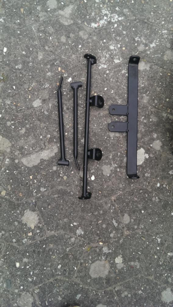 Und doch ein Problem: Eine Querstrebe, auf dem Bild die dritte von links, soll laut Anleitung, an die Halterung der Hupen geschraubt werden, welche, laut Anleitung, vorne an der Gabel sein soll.