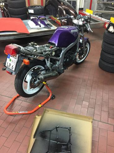 Seitenteile unter der Sitzbank & Tank werden passend in dem Rot lackiert