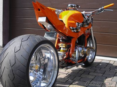 BJ 92, ursprünglich rot, ganz gut umlackiert - SBL Umbau mit Melvin Stahlflex - Remus Komplettanlage mit dem wohl einzigartigsten Design überhaupt, entstanden durch 60km Vollgas auf der Bahn (Dämpfer mit Kammern und nicht Wolle, Lack nicht für Hitze geeignet, Füller schön eingebrannt) - Miniblinker - Spiegel, in denen man nichts sieht - Heidenau K66 Snow M&S für ausreichend Grip - Sturzbügel für den Fall der Fälle