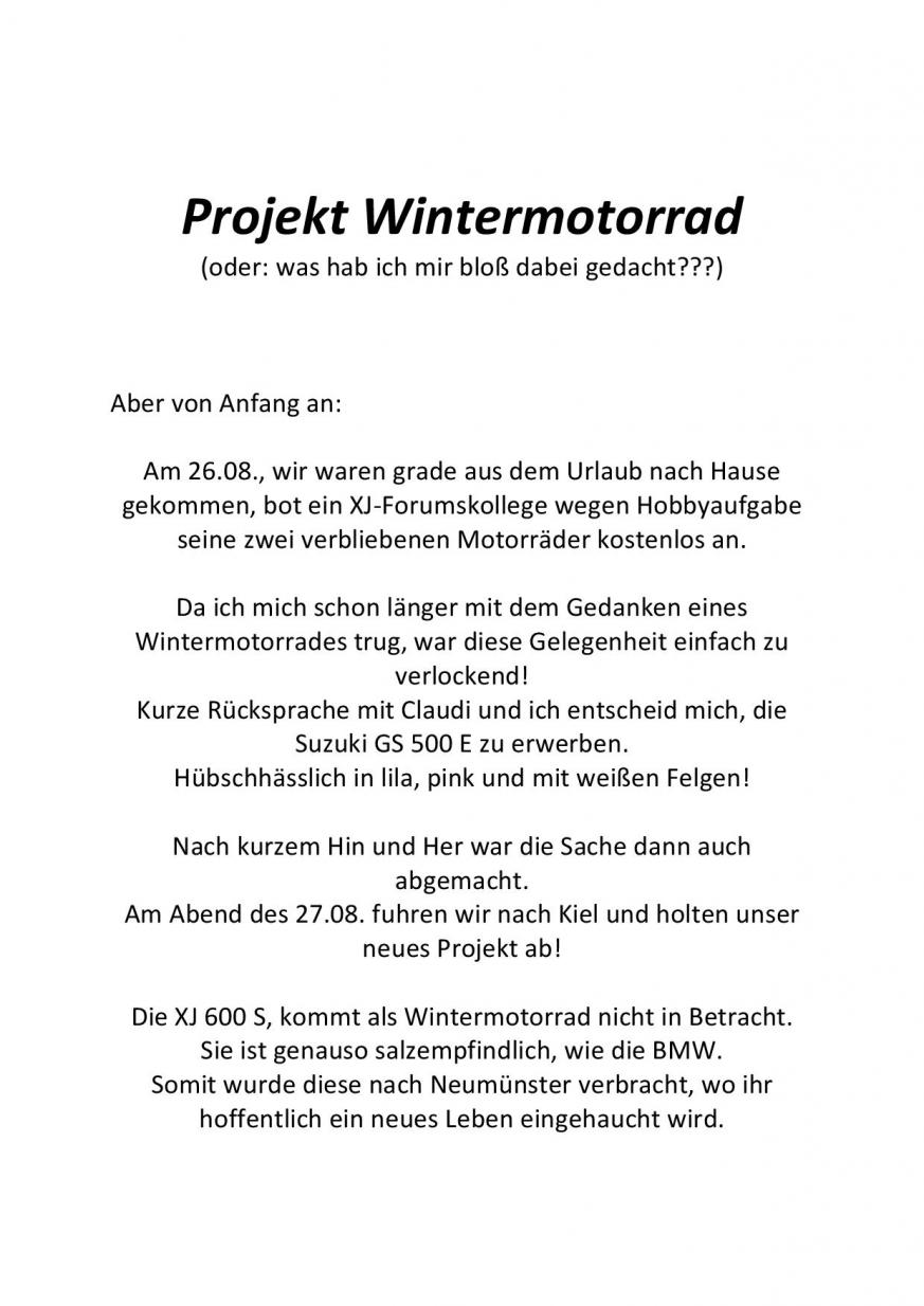 Ich habe mich ja in diesem Forum angemeldet, weil ich eine GS 500 E geschenkt bekommen habe und selbige zukünftig als Wintermotorrad nutzen will. Meine BMW ist dazu nicht geeignet.