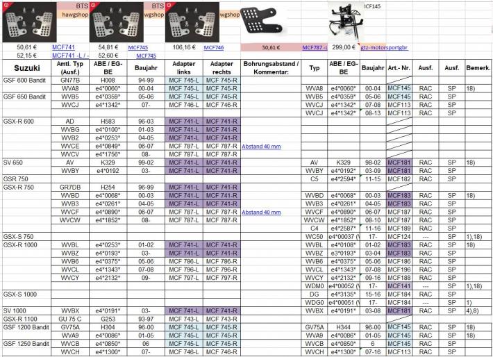 Aber Informationen über die Anbaumaße sind - unter Corona Bedigungen - noch schwerer zu bekommen. Kein von mir angeschriebener Händler kennt die Lochabstände der Adapter. Und einfach zum nächsten Händler fahren und Messschieber dran halten geht ja gerade nicht. Hinzu kommt, dass z.B. TRW Lucas zwar mit Adapterplatte arbeitet und viele Modelle abdeckt, aber auf der Homepage zu keiner einzigen Anlage Anbaufotos hat. Es gibt nur eine Anbauanleitung mit einigen Detailfotos ohne Angabe des Modells. Auch auf ebay und besonders bei Louis gibt es nur "ähnliche Abbildungen". Die brauchbarste Informationsquelle sind noch ebay Anzeigen von Gebrauchtanlagen, wo man anhand der Stellung von Rasten und Hebel zu den Befestigungsbohrungen in etwa abschätzen kann, in wie weit die Rasten nach hinten und nach oben wandern. Nach den mir zugänglichen Unterlagen kommen Anlagen für folgende Fahrzeuge in Frage (alle Beispiele mit TÜV Gutachten): Am besten geeignet: Honda CBR 900 RR SC28 und SC33, Lochabstand 80 mm. Nacharbeit notwendig, nicht wegen der Suzuki Toleranzen wie hier schon mal zu lesen, sondern weil die GS ein Abstandsmaß von 81 mm hat und die Durchgangsbohrung nur 8,6 - 8,7 mm hat. Möglich wären Adapterplatten MCF721 für die Verwendung der Original GS Rasten. Eine komplette Anlage von TRW gibt es für die SC28 / 33 leider nicht. Alternativ ältere Anlagen von ABM die keine variable Befestigung haben: ABM für SC28 - hydraulischer Bremsschalter oder ABM Cassico für SC33, Anlenkung für Schaltgestänge müsste nach unten gelegt werden, ob Anbau der Bremspumpe passt, ist schwer zu erkennen. Evtl. geeignet wären Anlagen für die CBR 600 F. Das Abstandsmaß der Befestigung ist 73 mm also reine Adapter wären unbrauchbar, aber eine komplette Anlage könnte man passend machen: Phoenix Alu poliert mit Aufnahme für elektrischen Bremsschalter die Arme könnten lang genug sein, um sie auf 81 mm aufzuweiten. Ob das ohne sichtbare Spuren geht (wegen aaS)?? Yamaha R1 (leider habe ich noch keine Zuordnung des Baujahrs gefunden) Lochabstand 79 mm. Hier wird es schon schwieriger, aber machbar, wenn man auch die Bremspumpe von einer R1 bekommt. Z.B. Yamaha R1 rechts die Ärmchen ließen sich wieder biegen und die Anlage würde auch keinen Argwohn der Rennleitung auslösen. Nur der aaS könnte sich daran stören, dass eine Nachverfolgbarkeit der Teile schwierig ist, wenn Yamaha die auch nicht kennzeichnet (wie das R6 Federbein, das ich deshalb noch nicht eingetragen bekommen habe). Zum Abschluss noch mal mein Erkenntnisstand zu Adapterplatten und Komplettanlagen mit den Teilenummern von TRW / Lucas. In der Kommentar-Spalte habe ich die bisher gefundenen Lochabstände eingetragen. (Wenn jemand gesicherte Maße beisteuern kann, trage ich die gerne nach.) Zu den farblich markierten Teilenummern habe ich im Netz Hinweise gefunden, dass die schon mal jemand verbaut haben soll. Bei den anlagen für die Suzukis konnte ich aber auf den Bildern erkennen, dass die Rastenposition sich durch die Austauschanlage nicht erkennbar nach hinten verschiebt. |