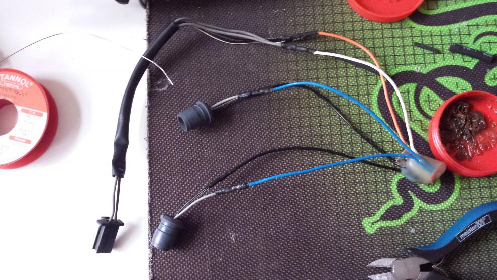 Selbstklebende Aluminiumfolie gibt's beispielsweise in Baumärkten zu kaufen (bei Hornbach weiß ichs, hatte ich da schon in der Hand; andere sollten sowas aber auch haben). Sieht dann SO aus. EDIT: Ich hab meiner Selbstbau-Tachobeleuchtung (siehe weiter oben) mal ein Update spendiert, da die Beleuchtung vom DZM nen Wackler hatte. Ich hatte in der ersten Version den Spannungsregler zum Einen doppelt verbaut, einmal für den Tacho und einmal für den DZM, und zum Anderen die Platine in den Bechern untergebracht. Da ich jetzt aber zur Wackelkontaktbeseitigung den Becher sowieso nochmal aufmachen musste, hab ich gleich beide geöffnet und die Schaltung dahingehend optimiert, dass ich nur noch einen Spannungsregler für BEIDE Anzeigen habe, den ich dann zudem auch nicht mehr im Becher untergebracht habe, sondern in dem kleinen mittig gelegenen Zwischenraum zwischen den beiden Bechern in der schwarzen Halterung, verdeckt von der silbernen Blende. Dafür habe ich allerdings die beiden Stromleitungen für den Tacho und DZM zu einer Leitung kombiniert und auf die Platine geführt (also parallel geschaltet). Funktioniert aber super und genau wie erwartet. Dadurch, dass die Platine aber jetzt nicht mehr geschützt im Becher untergebracht ist, hab ich die einfach komplett mit Heißkleber vergossen; falls es doch wieder Probleme machen sollte, kann ichs einfach mitm Heißluftfön wieder schmelzen (oder einfach neu aufbauen; kostet ja nicht die Welt, besteht ja eh nur aus dem LM317, einem 220Ohm Widerstand und dem Poti zum Regeln der Helligkeit). Hab auch einige Bilder gemacht um das mal zu verdeutlichen: Anhang 17785 Anhang 17786 Platine von unten (wirklich einfach aufgebaut): Anhang 17787 Hier sieht man den Stecker, der dann einfach in die originale Lampenfassung gesteckt wird, ist quasi der Sockel der originalen Birne an den ich den LED-Steifen gelötet hab: Anhang 17788 Das ist die fertige Kabelage, wie unschwer zu erkennen besteht das aus der vergossenen Platine, den beiden Fassungen in die dann einfach wieder der Sockel reingesteckt wird und dem Stromkabel, alles fein säuberlich mehrfach verschrumpft: Anhang 17789 Arbeitsaufwand für alles war nicht groß, hab mir aber auch Zeit gelassen... Das schwierigste war eben nach wie vor das Auf- und Zubördeln, aber das dürfte jetzt für eine ganze Zeit passé sein, es sei denn die LEDs machen die Grätsche, aber dadurch, dass die bei ca 11V laufen und die Spannungsspitzen durch die Schaltung abgefangen werden, sollte es da für die nächsten Jahre keine Probleme mehr geben. Bei Bedarf kann ich mich auch nochmal ransetzen und nen Schaltplan zeichnen, ein bisschen Übung in EAGLE könnte mir auch nicht schaden :-D Da könnte man ja langsam aus dem Thread hier nen Sticky machen :grinser2: |