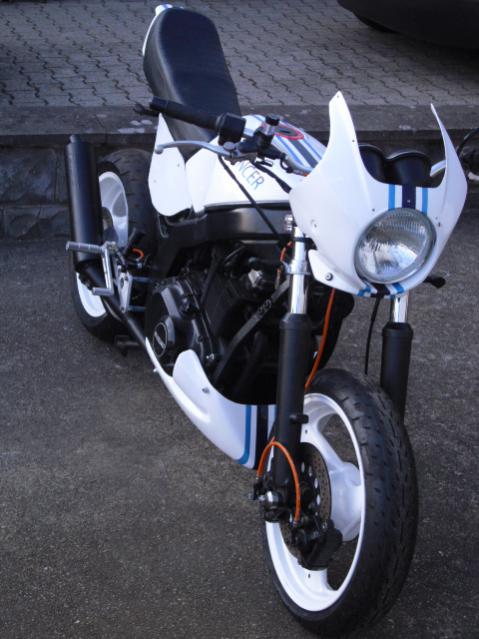 Suzuki GS 500 E, GM 51 B, Baujahr 1989, 31.000km Umbauten / Änderungen: - Gabel Harley, 2" kürzer, passendes Joch angefertigt - Rad vorne: 3,5x17, eigentlich ein Hinterrad, abgedreht und linke Seite mit Deckel verschlossen, weiß gepulvert - Reifen vorne: Shinko 003 120/60-17 - Fender Yamaha - Tachoantrieb original - Bremsscheibe original - Bremssättel: 1x GS 500 und 1x GSXR - Bremsankerstrebe Eigenbau - Bremsleitungen vorne orange mit schwarzen Fittingen - Lenker SBK mit universal Klemmböcken - Cockpit Original Aufnahme Selfmade - Zünschloss seitlich versetzt - Scheinwerfer CB 450 - Lampenmaske Original Bj 89 mit modifiziertem Halter - Bremsarmatur GSXR mit seperatem Behälter - Kupplungsarmatur Yamaha - Züge alle Original - Tank Original - Haupständer entfernt - Auspuffkrümmer Stahl Original, Adapterrohr und Auspuff IXIL in schwarz - Rastenanlage Gimbel mit Eigenbau Fersenschonern - Bremspumpe Original mit gekürzter Stange - Hydraulikbremslichtschalter - Bremsflüssigkeitsbehälter für Nissin Pumpe, schwarz eloxiert mit Schauglas - Bremsleitung Orange mit schwarzen Fittingen - Bugspoiler BALU - Federbein WILBERS in 305mm, Umlenkung keine Ahnung, Knochen 185mm - Schwinge, Bandit 1200 mit Unterzug, verlängert und gepulvert - Bremse hinten: GSXR mit Schwingenabstützung - Felge hinten: 5,5x17, weiß gepulvert - Reifen hinten: Shinko 003 180/55-17 - Heckrahmen umgeschweisst, 2 Halterungen neu gesetzt - Sitzbank Kreidler - LED Rücklicht - Blinker mit dunklem Glas - Verstellbarer Kennzeichenhalter - Rückstrahler oben im Höcker drin - lange Kette mit Clipschloss - Versatzritzel 3,9mm - Batterie irgendwas kleines! - Kettenschutz Metall schwarz gepulvert - Lackierung in weiß mit blauen Streifen, neu http://forum.gs-500.de/attachment.ph...2&d=1310128619 http://forum.gs-500.de/attachment.ph...3&d=1310128632 |