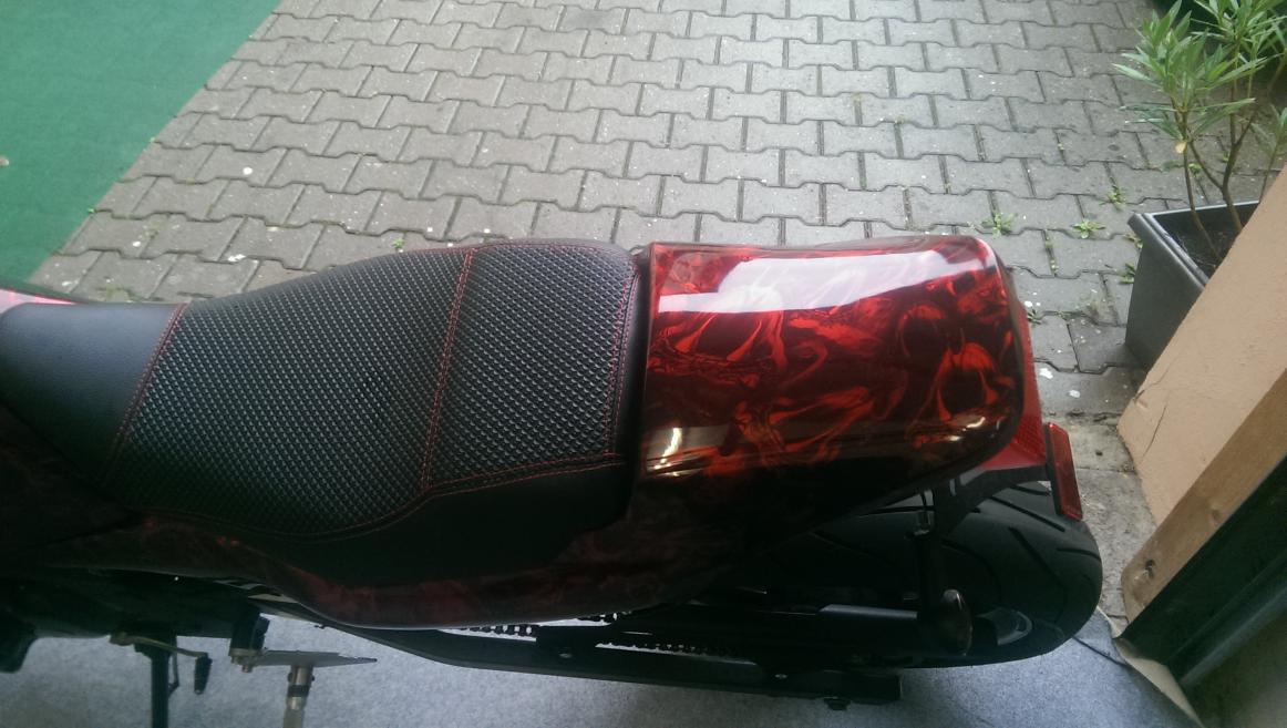 nach dem Füllern nochmal alles geschliffen und erstmal silber vorlackiert. Danach mehrere Schichten der Candy-Lasur drauf, bis der gewünschte Farbton erreicht war: Anhang 23371 Anhang 23372 Anhang 23373 Anhang 23374 Dann der Wassertransferdruck: Wegen der der Form der Gimbelverkleidung hab ich diese in zwei Schritten beschichtet. Den vorderen Fender und die Heckverkleidung hab ich leider versaut. Dekor war verlaufen usw. Also nochmal von vorne. Schleifen, lackieren und beschichten, was ein Mist. Beim 2. Anlauf war es dann aber zufriedenstellend: Anhang 23375 Anhang 23376 Anhang 23377 Anhang 23378 Danach noch Klarlack drüber, das war`s. Bei der Montage dachte ich mir, dass die blaue Instrumentenbeleuchtung des Koso irgendwie nicht zum dem rot passt. Beleuchtung ändern wollte ich aber auch nicht, also hab ich als kleine Spielerei noch den Tankdeckel von innen blau beleuchtet. Sieht auf den Bildern aber krasser aus als es eigentlich ist. Zusätlich noch die Soziusrastenhalter entfernt: Anhang 23379 Anhang 23380 Anhang 23381 Da ich ja kein gelernter Lackierer bin hatte die Oberfläche in Teilbereichen für mein Geschmack eine zu starke Lacknabe und teilweise starken Sprühnebel. Also gestern nochmal alles mit 2000er angeschliffen und heute wieder aufpoliert: Anhang 23382 Anhang 23383 So, jetzt polier ich mal noch fertig und mach alles sauber. Morgen dann Fotos vom fertigen Bike......... |