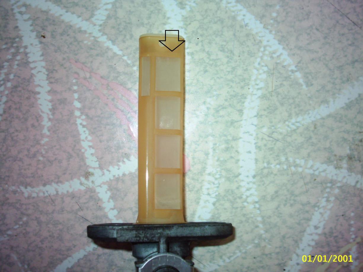 Es gibt keinen Reservetank. Es gibt nur einen Tank. Am Benzinhahn gibt es eine Reservestellung. Der Benzinhahn im Tank hat zwei Abläufe. Bei einem (für PRI und RES) ist der Auslauf knapp über dem Tankboden, beim anderen (für ON) etwa 5-6 cm höher. Fällt der Benzinpegel im Tank unter den oberen Ablauf, muss man auf RES umschalten. Der Pfeil im Bild weist auf den RES/PRI Ablauf.