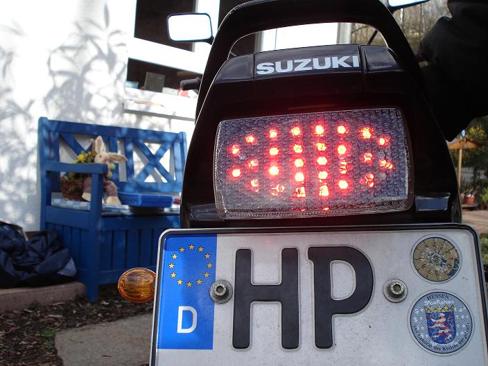 Heute kam per Post ein (gebrauchtes) LED-Rücklicht "Plug & Play". Leider war die Fassung verbeult, sodass kein dauerhafter Kontakt hergestellt werden konnte. Abhilfe: Zange(n) + Lüsterklemme(n) 1. Versuch...Bremslicht leuchtet immer 2. Versuch...so soll es sein Also alles wieder brav zusammengebaut, Kabel ordentlich gekürzt und verstaut und fertig. Aufwand: ca. 45 Minuten Ergebnis: siehe Bilder Fazit: ca. 15€ günstiger als das Neuteil, hat sich mit dem kleinen Arbeitsaufwand gelohnt [attachment=3:2oj0xjaq]DSC01788.JPG[/attachment:2oj0xjaq] [attachment=2:2oj0xjaq]DSC01790.JPG[/attachment:2oj0xjaq] [attachment=1:2oj0xjaq]DSC01792.JPG[/attachment:2oj0xjaq] [attachment=0:2oj0xjaq]DSC01793.JPG[/attachment:2oj0xjaq] Was ist sonst noch gemacht? Superbikelenker Stahlflex vorne Mini-Blinker Edelstahl-Kettenschutz Also bis auf ein paar feine Kleinigkeiten original |