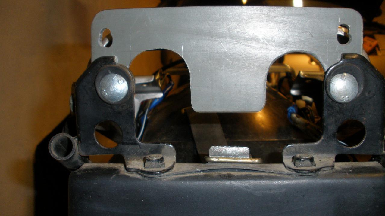 Die Platte wurde an der alten Rücklichthalterung befestigt und das neue wird nun an den beiden oberen Bohrungen geschraubt und die zwei Halbkreise unten sind für die Lampenfassungen. Da die Kabel (bei mir) zu kurz waren, habe ich die alten Lampenfassungen genommen.