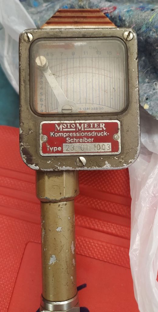 Gerade eben habe ich Kompression gemessen und völlig verschiedene Werte bekommen. Also Motor war noch vom Heimweg relativ heiß, Kerzen raus und starten. Dafür hatte ich mir ein (Billig)Gerät (39Euro) im Netz gekauft und von einem Kumpel einen alten Schreiber von Motometer (werden viele Ältere noch kennen) geliehen. Den Motometer-schreiber kenne ich noch aus meiner Lehrzeit