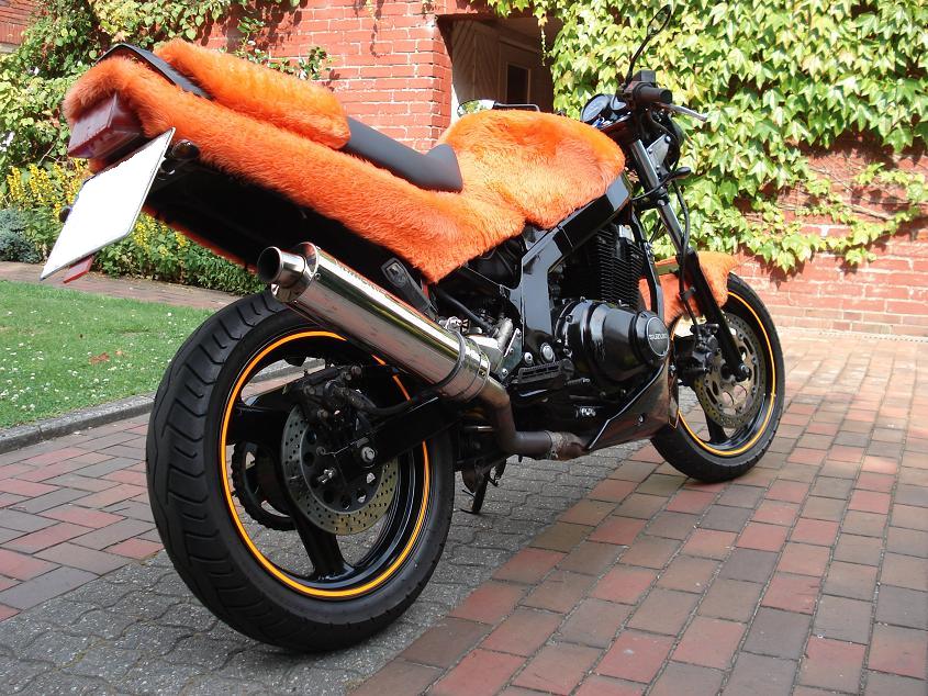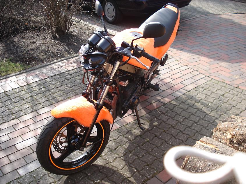 da mir übern Winter sowieso meist langweilig is und ich als Zivi nich unbedingt "Arbeitsstress" habe wollte ich jetzt mal an meinem mopped schrauben... Hier die "to do" Liste: Rahmen entrosten und lackieren [done] Felgen entrosten und lackieren [done] Verkleidungsteile neu lackieren oder mit Fell beziehen [done] Neues Federbein [done] Neue Bremsscheibe hinten [done] Sitzbank neu beziehen [done] Neuer Scheinwerfer [done] Neuer Hinterreifen [done] Neue Blinker [done] Neue Griffgummis [done] Soziussitzabdeckung [done] Diverse Schrauben erneuern [done] ...ich bin mal gespannt ob das alles was wird... hab schonmal n paar Bilder zum derzeitigen Zustand...und ne Frage |