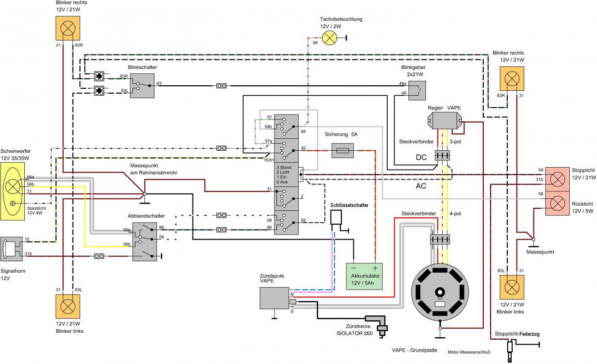 Stecker ziehen, Zündstellungen durchprobieren und dabei die Kontakte zwischen den Steckverbindungen durchmessen. Dann weißt du wer mit wem wie zusammenspielt und kannst entsprechend überbrücken/zusammenlegen. Hab mal fix gegoogled: Vielleicht ist hier ein besser zu durchschauender Schaltplan dabei: http://moser-bs.de/index.html (unter Simson kannste dir den Typ raussuchen) oder wie isses mit diesem: http://www.reichtuning.de/_schaltpla...ruecklicht.gif