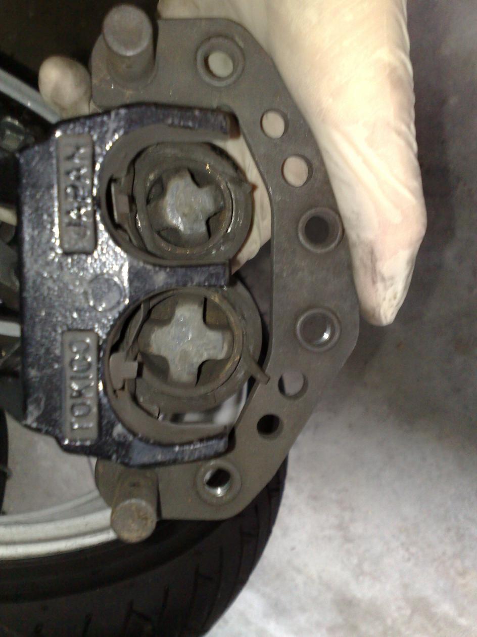 Die Plastikblöcke in den Bremskolben sind verkehrt herum drin. Die "plane" Seite zeigt korrekterweise zur Bremsbacke/scheibe!!!