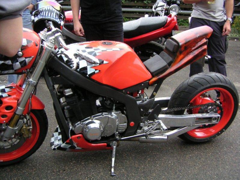 weil es letzten Monat so schön war, mach ich nochmal mit! Sind zwar schon ein älterer Zustand, aber egal! Umgebaut war folgendes: - RGV 250 USD, polierte Rohre und polierte Gabelbrücken - GSXR Felge vorne 3,5x17 mit 120/70-17 - Fender MGM - 4 Kolben Bremsanlage - Helm mit Scheinwerfer als Lampenmaske, Visier öffnete elektrisch - kleine Spiegel an der Motoraufnahme - 1" Lenker mit passenden Ritz Risern - Verchromte Kupplungs- und Bremsamatur - MBD Bugspoiler - kleine Laser Töpfe re + li - verlängerte B12 Schwinge mit Unterzug und poliert - GSXR Felge hinten, 6,25x17 mit 200/50-17 - Rastenanlage Honda SC50 - Heckrahmen geändert - Storz Heck - Sigma Tacho mit Beleuchtung - Kellermann Blinker hinten - LED Rücklicht - gekürzter Seitenständer Chrom - Rahmen dunkelgrau gepulvert - Taster mit seperater Steuerung - Stahlflex vorne und hinten - Lange Kette - Übersetzung 16/42 - Orange mit Raceflaggs - kompett vom Tüv abgenommen