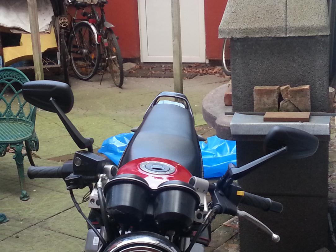So. Die Rückspiegel sind angebaut. Ging relativ problemlos (man sollte natürlich das richtige Zwischenstück - Bolzen - nehmen^^´)