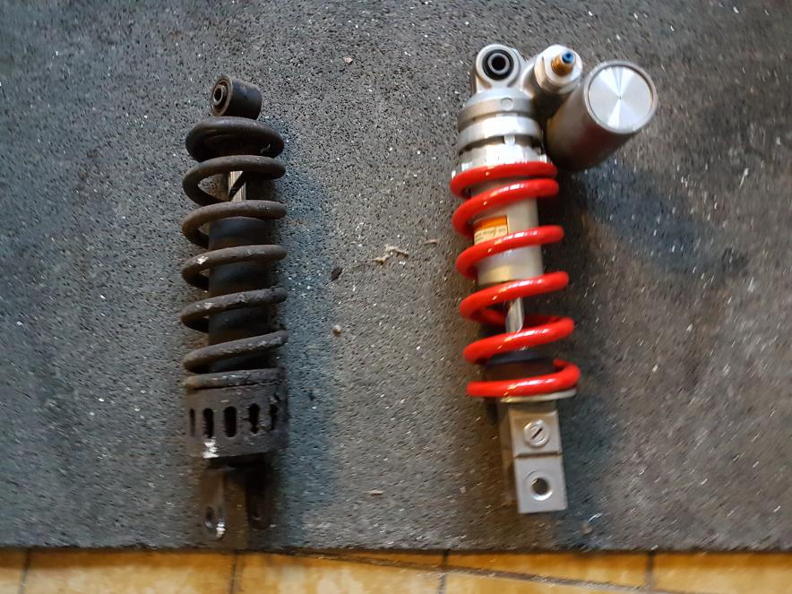 Nach langer Recherche im Forum wurde ich auf das R6 Federbein aufmerksam. Voller Tatendrang ersteigerte ich mir dieses Federbein fast neu für sehr kleines Geld bei eBay. Ein Kollege aus der Meisterschule konnte mir die für den Umbau nötigen Buchsen drehen. Ich hatte Glück! Das Federbein hat noch 1mm Luft zur Schwinge mit dem originalen Umlenkhebel. Aus meiner Sicht reicht dass, denn der Platz wird ja nicht weniger. Im Zweifelsfall rüste ich eben noch den Umlenkhebel der Bandit nach. Apropos Umlenkhebel, die Lager wurden bei der Gelegenheit vom alten Fett befreut und durch neues ersetzt.