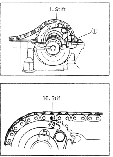 Zum Unterschied in deinem Bildern: Sie stellen alle dieselbe Position dar - denk doch mal nach warum!. Der Pfeil muss PARALLEL zur Dichtfläche sein - egal ob er auf den Anfangs-Bolzen oder Endbolzen eines Gliedes zeigt (das hängt davon ab wie die Kette unten an der KW eingehängt ist). Du stellst ja RELATIV zur T-Marke ein - nur das zählt. Dazu ist dann die Position 2 vorgegeben, von der man 18 Glieder zu 3 zählt.