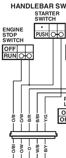 O/Bl kommt vom Seitenständerrelais mit 12V wenn da alles OK ist (Leerlauf oder Ständer oben) O/W ist +12V für Zündung etc B/Y geht (über den Kupplungsschalter...) direkt zum Anlasserrelais. Aber ja, Killschalter ist immer ein guter erster Blick wenn die Karre nicht laufen will |