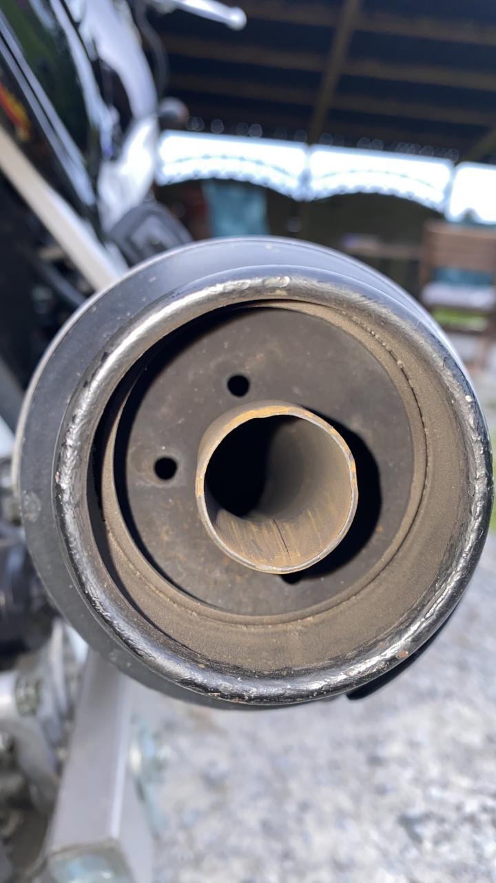Guck mal, ob da jemand hinten rein gebohrt hat. Ich kenne eine GS, die klingt fast genau so und da sind um den Austritt 4 10mm Löcher gebohrt.