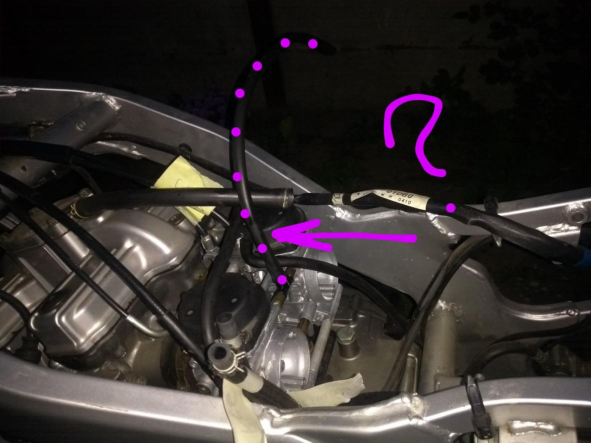 würdet ihr bitte angeben, wie der Schlauch am oberen T-Stück zwischen den Vergasern verlegt wird und wo dieser angeschlossen wird? Ich bin trotz der Beiträge im Forum hierüber unsicher. Das Foto zeigt den Schlauch willkürlich, frei im Raum. Grüße Kay |