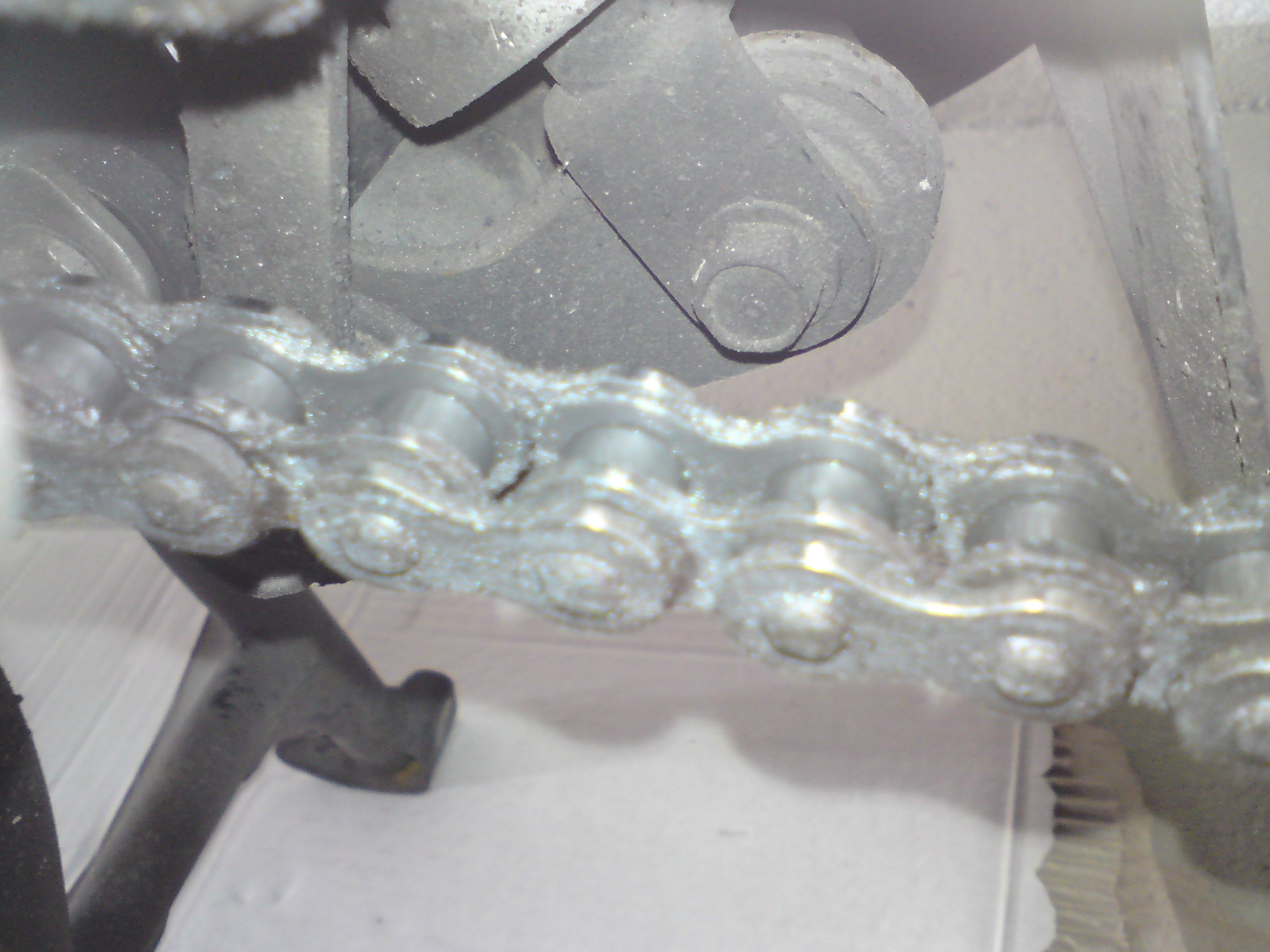 Die Kette ist vermutlich erledigt - scheint bereits ungleichmäßig gelängt zu sein, oder es sind bereits einige Glieder in der Drehung blockiert..... In jedem Fall ist ein neuer Antriebssatz fällig - und ich würde damit nicht mehr lange warten.......