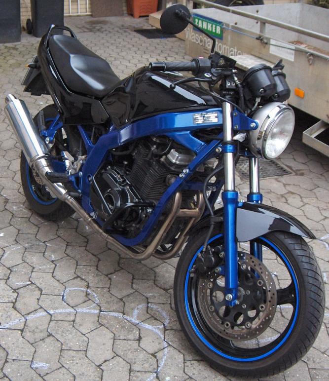 GS500E Bj. 91, Kilometerstand 47726 Änderungen Lackierung in Pearl Still White und Pearl Deep Blue Tankdeckel in Alu lackiert, blaue Schrauben ovale Blinker ovles Rücklicht Stahlflexbremsleitungen vorne und hinten Superbikelenker runde Lenkerenden ovale Spiegel Blaue Tachoscheiben Neuer Kettenschutz Krümmer lackiert blaue Felgenrandaufkleber |