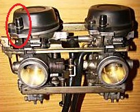 Die Schraube (mit Feder, Scheibe und O-Ring) sitzt jeweils außerhalb der Schwimmerkammer (von unten, in Fahrtrichtung vor der Schwimmerkammer, versenkt (man sieht nur den Schlitzkopf)).