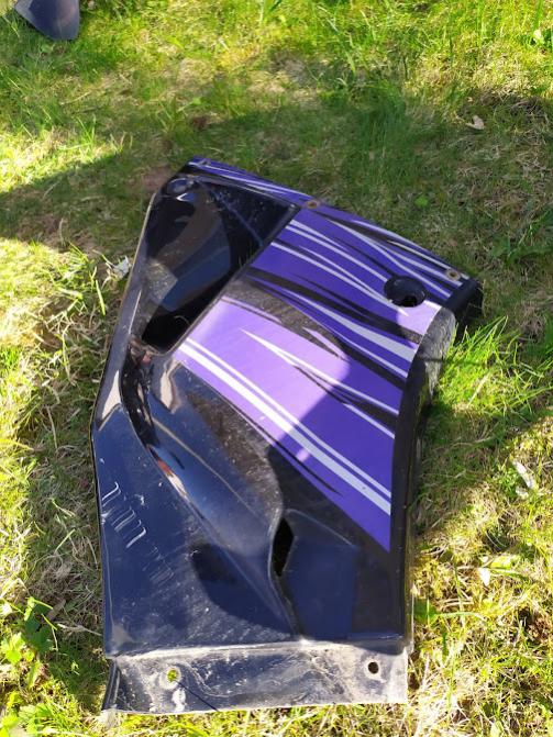 Hat an zwei Stellen (einmal Maske und ein Seitenteil) Schrammen und an zwei Schraubenlöchern der Seitenverkleidung ist sie etwas ausgebrochen. Alle Halter sind vorhanden, einen davon muss man etwas grade biegen. Scheinwerfer und Spiegel bleiben an der Maske. Leuchtmittel habe ich nicht geprüft. |
