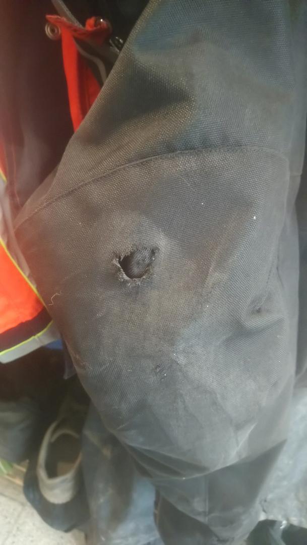 So sieht das Drama aus. Das eine Loch ist am Knie oberhalb vom Prothektor und die anderen sind unten am Knöchel quasi direkt am Übergang vom Stiefel zum Schienbein.