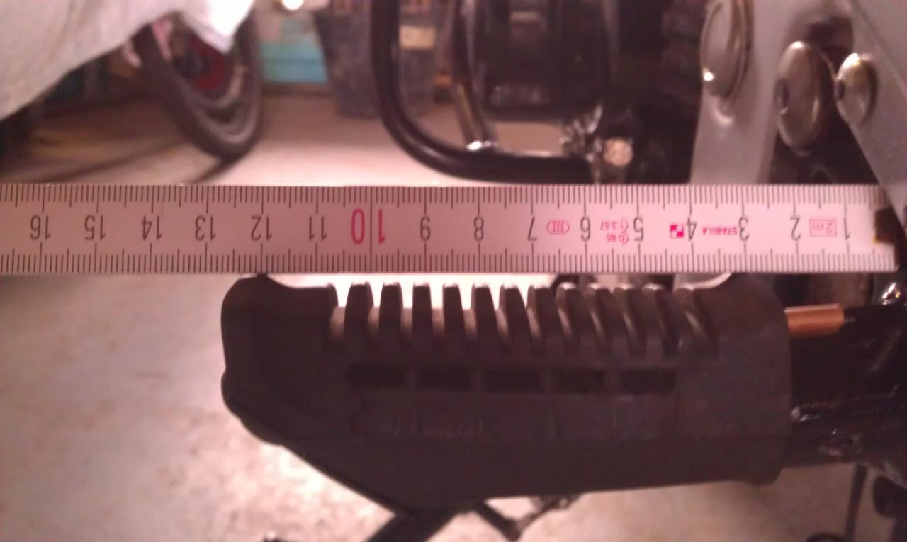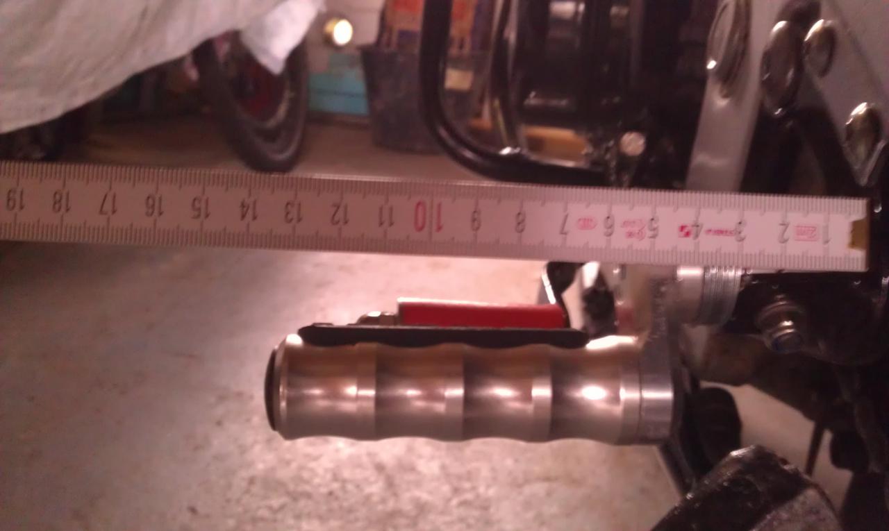 Ach Jungens, dafür sind die Alu-Rasten kürzer als die originalen und außen viel flacher (unten abgeschrägt), das macht die 5 mm zusätzliche Breite mehr als wett. Ich wette, ich habe dann deutlich mehr Schräglagenfreiheit als jetzt