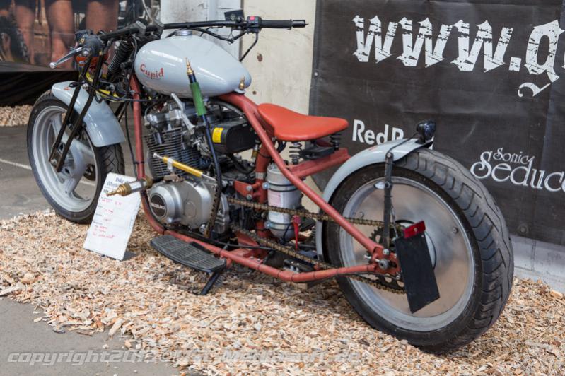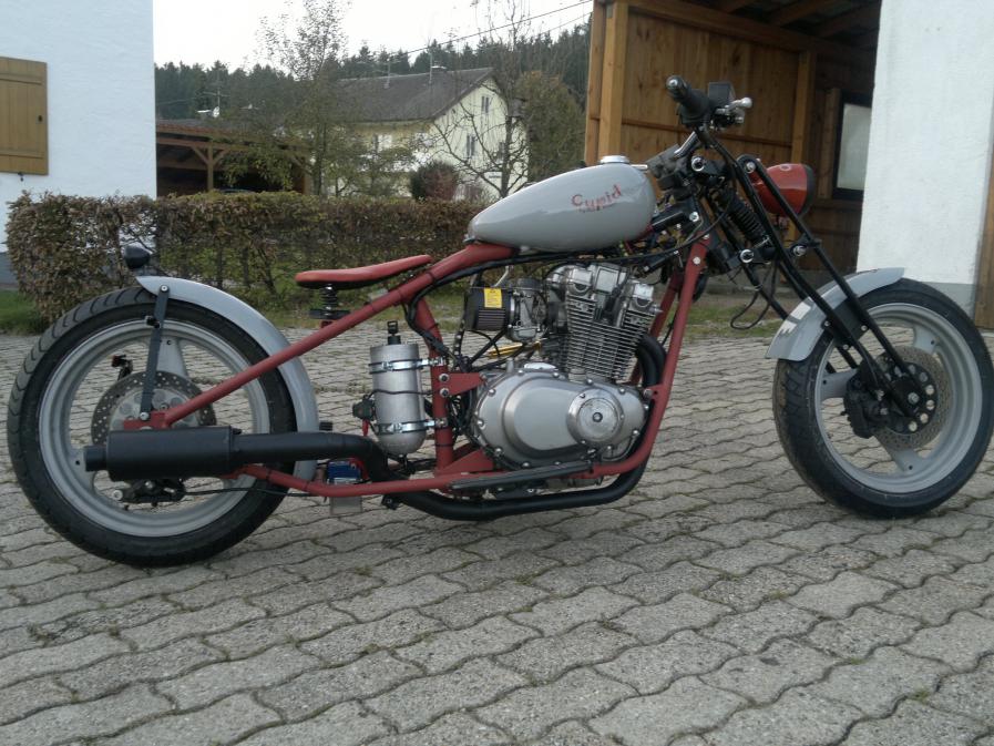 hier der Chopper: Rahmen Bj 36 umgeschweißt und starr Räder: 3,5x17 vorne und hinten, beides Hinterräder Bereifung: 120/60-17 vorne, 130/70-17 hinten Tank: Harley Benzinhahn: 2 mal Tacho: Sigma mit 12V Beleuchtung Batterie: GEL in einer Edelstahlwanne Motor: GS500e Vergaser: 27 PS Version Luftfilter: K&N Duplex Gabel: aus den Staaten Bj 57 Lenker: Eigenbau Elektrik: Eigenbau Auspuff: BSM Future Lampe: HG mit Eigenbaukontrollleuchten Schaltung: Von Hand Fußrasten: Trittbretter von Daelim Armaturen: Bandit 1200 Stahlflexleitungen in Schwarz Seitenständer: GS 500 gekürzt Schutzbleche: Zubehör Farbgebung: Rostrot matt mit Grau Glanz Zündschloss versetzt, Lenkungsdämpfer zur Schalthebelberuhigung, Hinterrad mit Scheiben zugemacht, Sitz komplett Eigenbau, Riser B12, seitlicher Kennzeichenhalter Eigenbau. usw. ohne Tüv, aber dafür fahrbereit Mehr Bilder und Bericht in der aktuellen Custombike Ausgabe 09/13