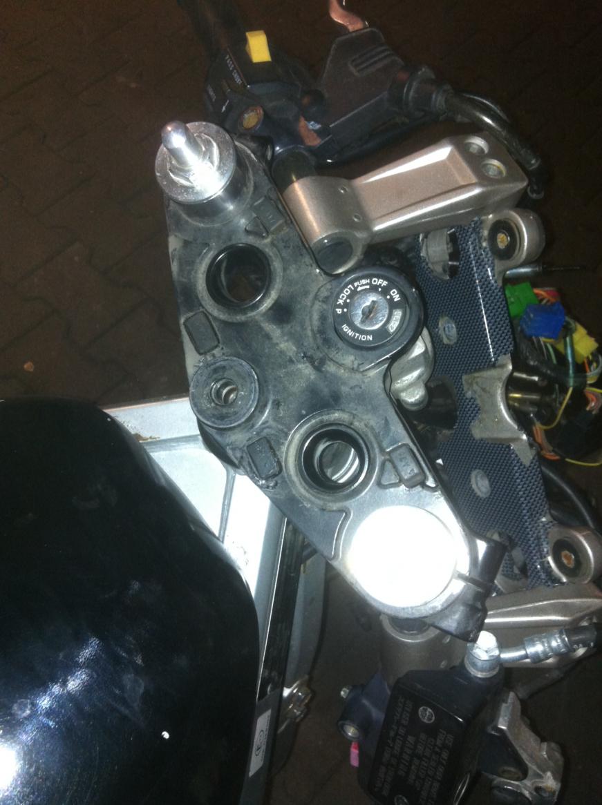 Wie kriege ich das Zündschloss mitsamt der schwarzen Platte, die die beiden Federgabeln festhält, runter? Auf dem Bild müsste zu sehen sein, dass ich schon die Schraube für das Lenkkopflager und die obere Platte abgeschraubt habe.