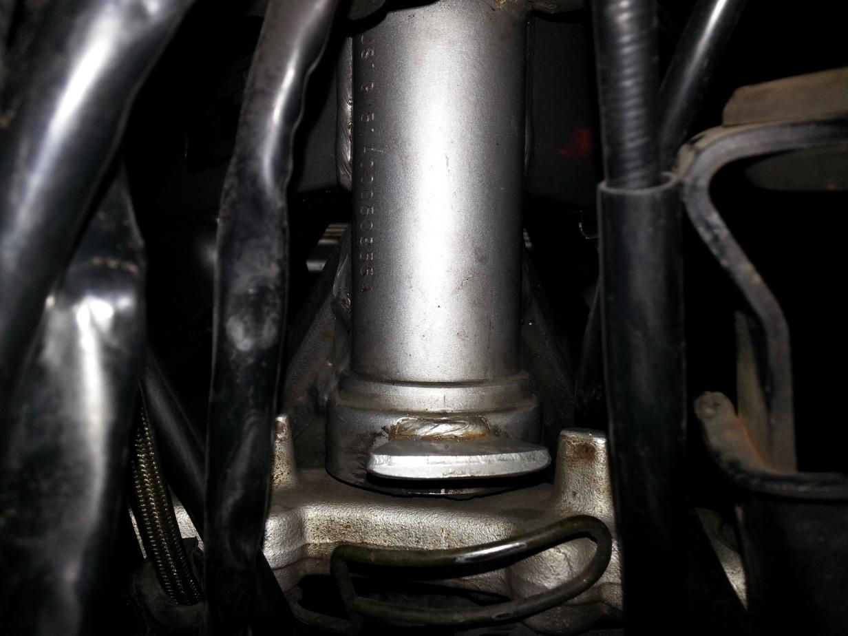 Hab mir dann als erstes den Lenkanschlag angeguckt. Der war noch an seiner Stelle und die Schweißnähte waren auch nicht gerissen. Alle anderen Schweißnähte rund um den Lenkschaft sind auch nicht gerissen.