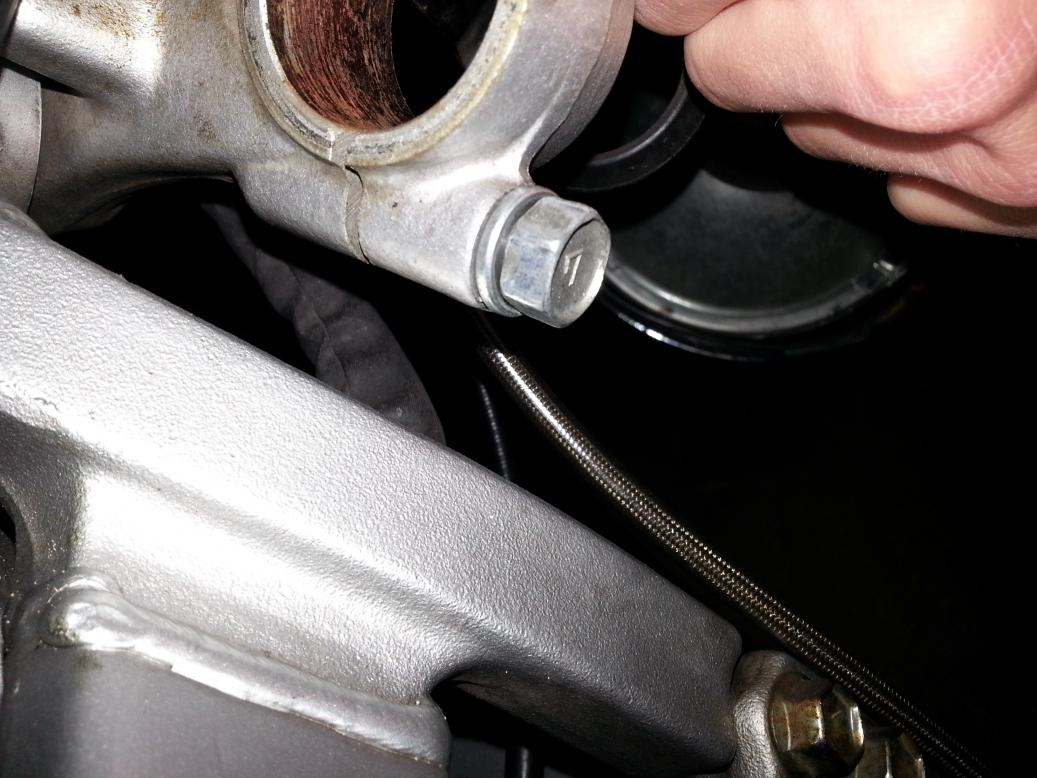 Um sicher zu gehen, ob nicht die Lenkereinheit verbogen ist, hab ich den Abstand der unteren Gabelbrücke zum Rahmen beim rechts und links einschlagen verglichen. Hier ist auch ein deutlicher Unterschied zu erkennen, links ~5mm rechts ~15mm. Die Gabelbrücke sah nicht verformt aus.