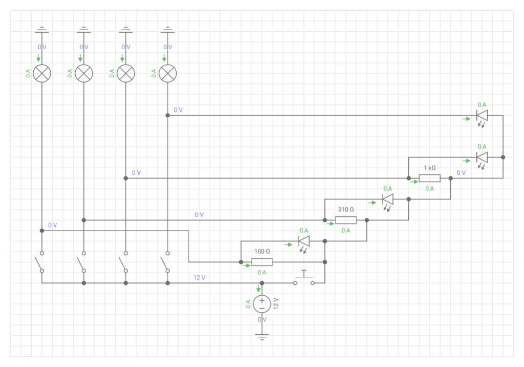Mein Ziel ist es, mittels eines Tasters jeweils eine LED je Birne zum leuchten zu bringen, indem ein Prüfstrom durch die jeweilige Lampe geleitet wird.