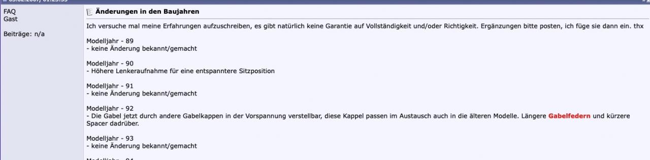 was ich bis jetzt erkenne ist, dass bei YSS - anders als bei Wilbers /Wirth welche ca. 540 mm lang sind, diese Spacer Hülsen (200 -250mm?) nun doch eingebaut werden müssen - wie bei den orig. Federn. In der FAQ Modelländerungen steht was bezüglich Federlänge + Spacer (diese Hülsen) : Ab BJ 92 längere Federn bei gleichzeitig kürzeren Spacern. (siehe Bild unten) Kommt dadurch evtl. die Unterschiedlichen YSS Längen von 275mm (bis BJ 91) + 330mm (ab BJ 92) zu Stande? Welche im Prinzip auch bei den orig. Federlängen bis 91 und ab 92 ähnlich sein müssten. Die bis BJ 91er Federn als auch kürzer sind. Ich plane bei meiner GS 500 BJ 91 (laut FAQ kürzere Feder + längere Spacer gegebüber orog. ab BJ 92) mit YSS Federn zu bestücken. Vermutlich brauche ich dann wohl diese 275mm YSS Federlänge, oder? Man hats mit den anderen Federn - welche ohne die SPacer auskommen und unabhänigig vom BJ wohl alle 540mm lang sein einfacher Hat jemand denn auch eine GS älter BJ 92 und YSS (welche Länge) erfolgreich verbaut? PS: NOOB Frage: Ist es denn möglich die Federn im eingebauten Zustand der Gabeln zu tauschen - sprich beim fahrbereiten Bike nur diese verschraubte Kappe zu öffnen Feder aus / neue FEder rein?. Als NOOB sehe ich in der Tat die Ölsache (Ölstand / Wechsel) als großes ?? Theoretisch könnte man das Öl ja absaugen(bleibt natürlich Verunreinigungen drin) und dann neu auffüllen. PS: Meine Simmerringe sind noch gut dicht, sonst würde ich nicht auf diese Idee kommen die nicht ausbauen zu wollen. Geändert von andreas_stgt (08.04.2020 um 09:53:42 Uhr) |