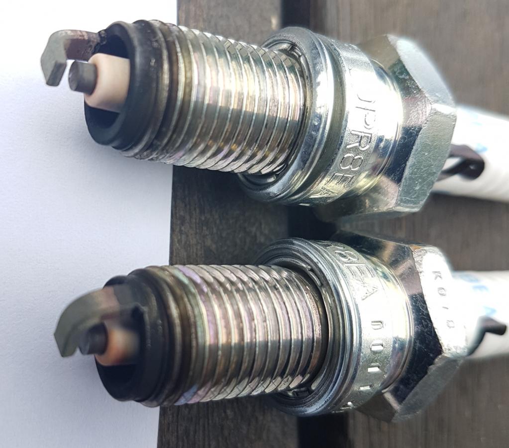 Die Zündkerzen sind erst seit ein paar hundert Kilometern neu drin und ich habe sie mir heute angesehen, siehe Foto. Das Kerzenbild scheint mir doch sehr nahe an dem Sollzustand den ich hier im Forum gefunden habe.