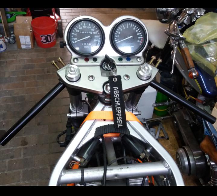 Stilecht und potentiell legal wäre ein M-Lenker mit ABE auf einer neuen Gabelbrücke mit Klemmböcken für Rohrlenker dann würd ich mir danach vermutlich die Finger schlecken weil es immer mehr Richtung Cafe Racer geht