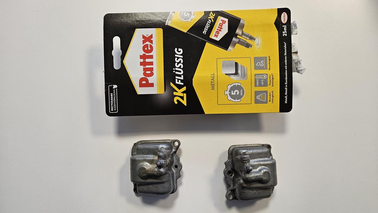 Nun habe ich beide Schwimmerkammern von außen und innen mit benzinfestem Epoxy Zweikomponenten Metall Kleber/Spachtel von Henkel/Pattex versehen. Schauen wir mal ob das hält. Bei einem Bekannten hält die Vergaserreparatur damit bereits seit Jahren. Ein Ablassen des Sprits ist nun nicht mehr mittels Ablassschraube möglich, aber das Problem ist hoffentlich erstmal behoben. |