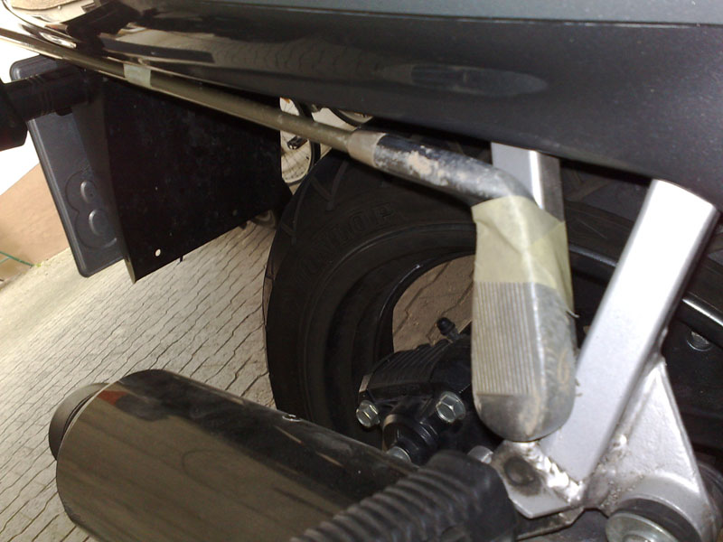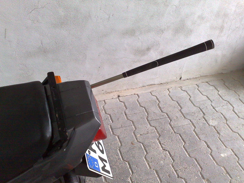 Ich habe eine ideale Stelle gefunden, der Schlägerkopf liegt an der Soziusfußraste und kann mit einem Gurt (testweise Klebeband da kein Gurt zur Hand) so befestigt werden dass der Schläger sich nicht nach Vorne oder Hinten bewegen kann. [attachment=2:3n8rwm9d]02042008169.jpg[/attachment:3n8rwm9d] Den Schaft habe ich an diesem schwarzen Rohr unter der Verkleidung befestigt. Ich geh davon aus das dieser Rahmen für Koffer o.ä. gedacht ist. Das ganze würde bombenfest halten. [attachment=1:3n8rwm9d]02042008170.jpg[/attachment:3n8rwm9d] Das einzigste Problem ist, auf diese Art und Weise steht hinten ein Stück Schläger raus, 40cm-50cm, was mich stört und glaube so auch sicher nicht in Ordnung ist. Oder kann ich das so belassen? Wie sieht es beim Motorrad mit Beladung aus die hinten raus steht? Beim Auto macht man ein Fähnchen dran und gut ist, aber beim Möp o_Ò ? [attachment=0:3n8rwm9d]02042008171.jpg[/attachment:3n8rwm9d] Gruß Apsodric |